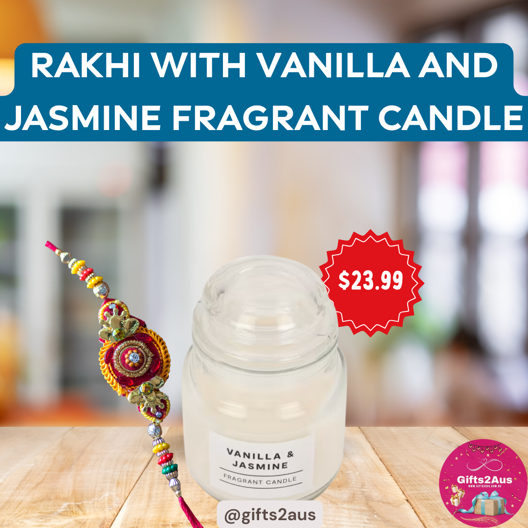 Perfect for gifting or enhancing your own space, our Rakhi with Vanilla and Jasmine Fragrant Candle set is a heartfelt way to celebrate Raksha Bandhan. Whether you’re expressing appreciation to a sibling or seeking to create a serene atmosphere at home, this set promises to bring sweetness, warmth, and elegance to every occasion.